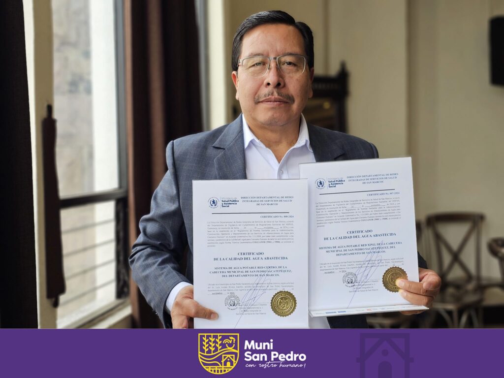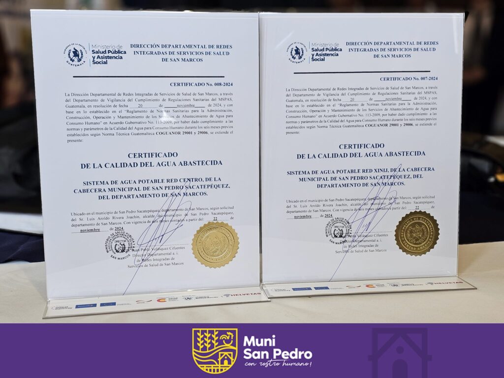 Integrantes del Concejo Municipal 2024-2028 que dirige Luis Rivera como alcalde municipal y el departamento de Agua y Saneamiento de San Pedro Sacatepéquez, recibieron el certificado de Calidad de Agua.