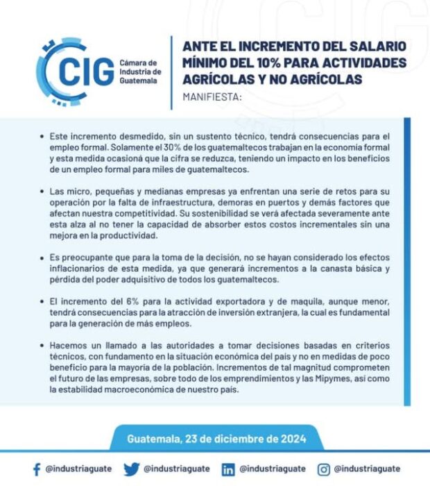 La Cámara de Industria de Guatemala (CIG) emitió un comunicado este lunes 23 de diciembre por medio del cual señaló que se trata de un incremento “desmedido y sin sustento técnico”, que tendrá consecuencias para el empleo formal.