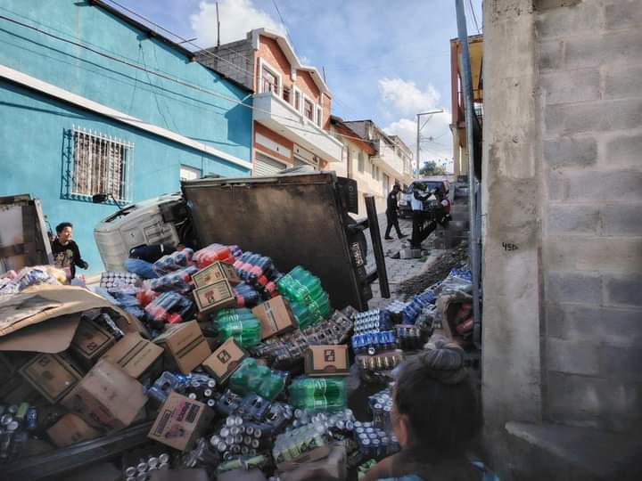 A pocos metros del mercadito de Minerva zona 2, de la ciudad de Huehuetenango, por causas que se ignoran volcó un camión que trasladada producto de consumo diario.