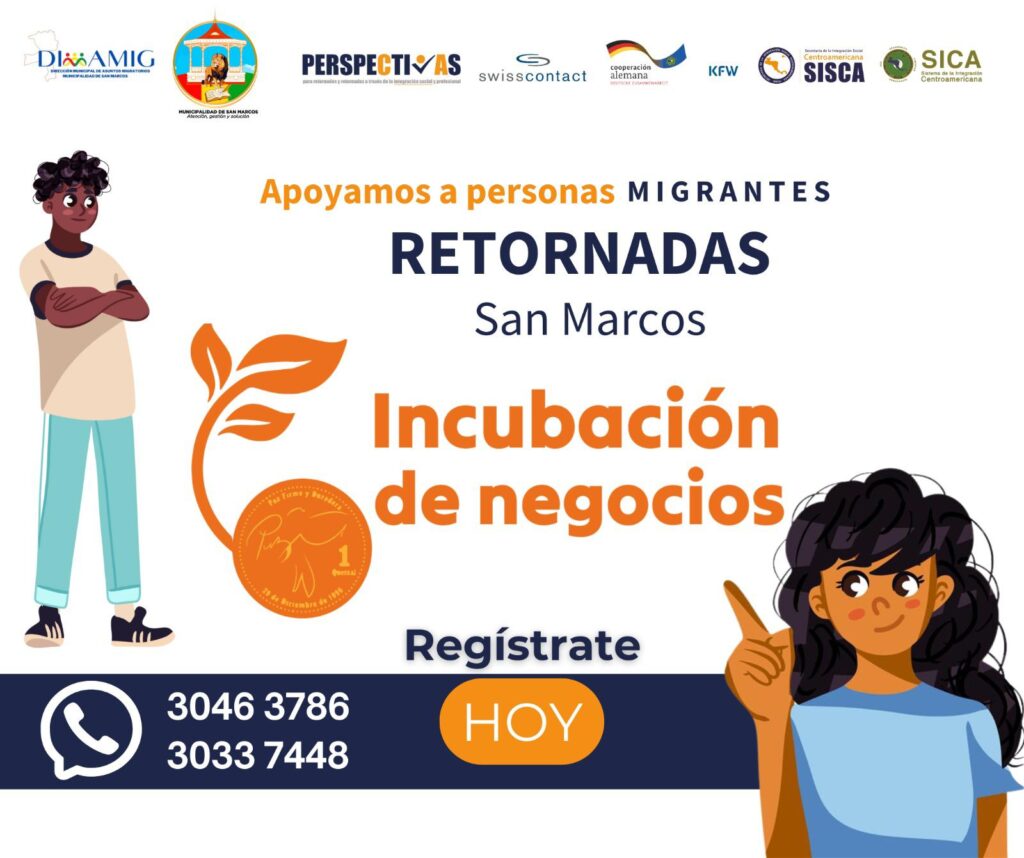 Los migrantes retornados tienen oportunidad de iniciar con un negocio a través del proyecto Perspectivas, el cual financiado por la Cooperación Alemana a través del Banco Alemán de Desarrollo KfW, ejecutado por la Secretaría de la Integración Social Centroamericana con apoyo de Swisscontact, en el marco de la alianza entre la República Federal de Alemana y la Región SICA.
