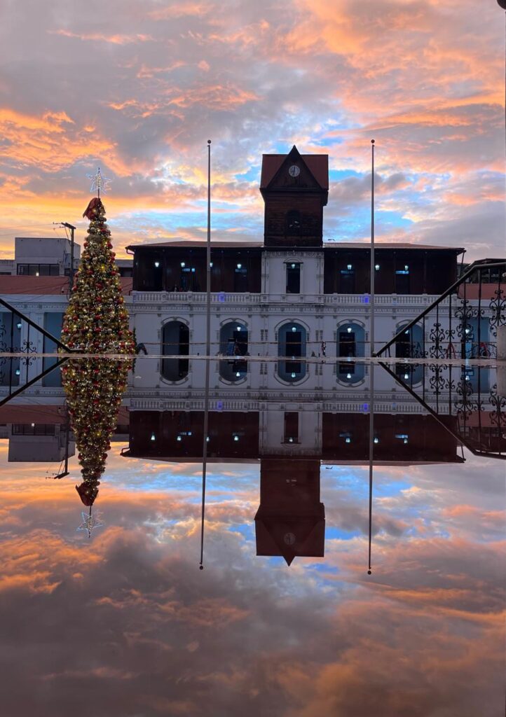 En San Pedro Sacatepéquez, aunque no fue posible apreciar el arco iris en toda su magnitud, la belleza natural también se hizo presente. Un ejemplo de ello fue la vista desde el antiguo edificio municipal sampedrano, donde el cielo teñido de color naranja ofreció una postal que reflejó las maravillas de Dios manifestadas a través de la naturaleza.